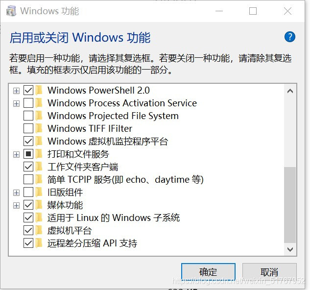 并在Windows功能(计算机右键属性—>查找框中搜索“程序”—–>“可选功能”——->更多windows功能)中开启”windows虚拟机监控程序平台”和“适用于linux的windows子系统”。