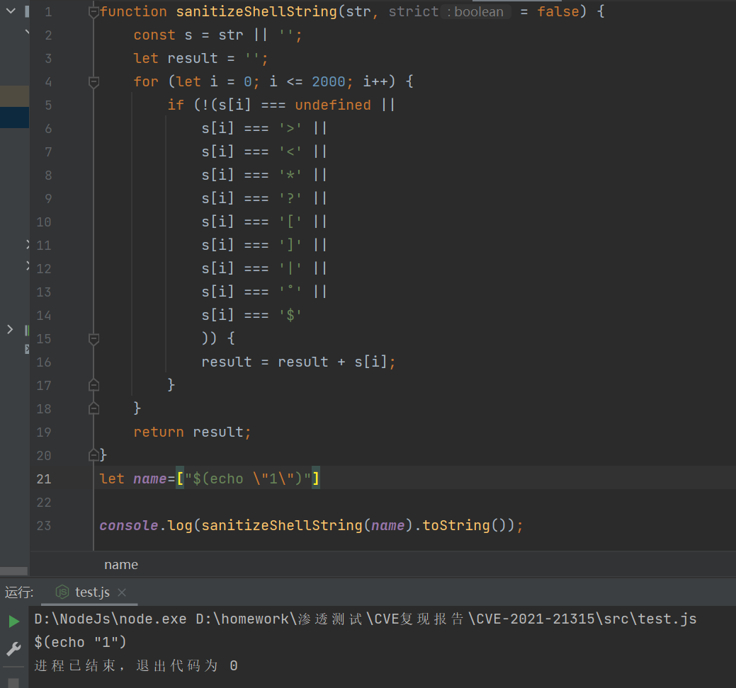这里我根据它的过滤函数逻辑尝试写了一份js文件,传入数组类型的name给过滤函数去处理,内容为一个带特殊符号的字符串,运行结果得到的却是没有经过过滤的name。